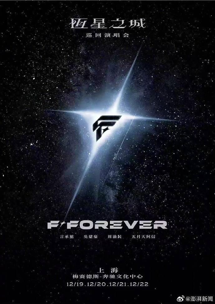 据澎湃新闻报道,12月4日,大麦网显示,“F✦FOREVER 恒星之城巡回演唱会-上海站”即将开售。在最新释出的海报上,言承旭、吴建豪、周渝民、五月天阿信的名字并排在一起。此前,阿信所属公司相信音乐表示,他将担任此次演唱会的制作人。